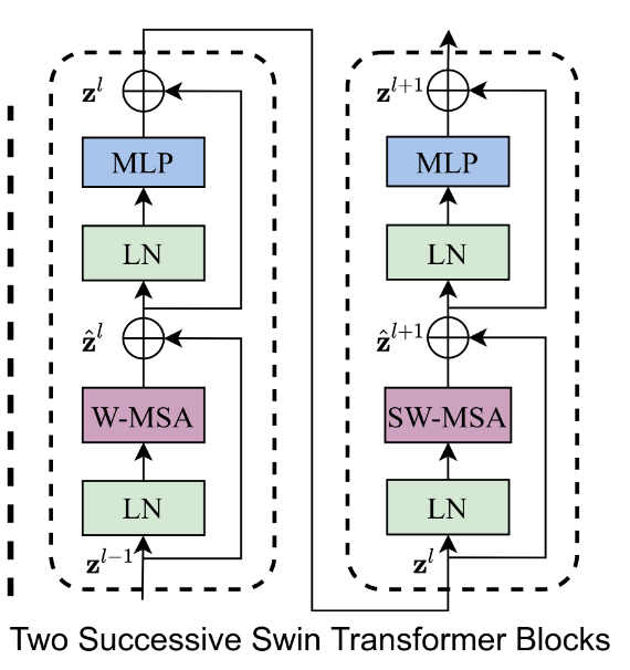 O Swin Transformer é construído substituindo o módulo padrão de multi-head self attention (MSA) (Traducao Wikipedia: autoatenção multicabeça) em um bloco de Transformer por um módulo baseado em janelas deslocadas (shifted windows), com as outras camadas mantidas sem alteração, como ilustrado na Figura 3(b).